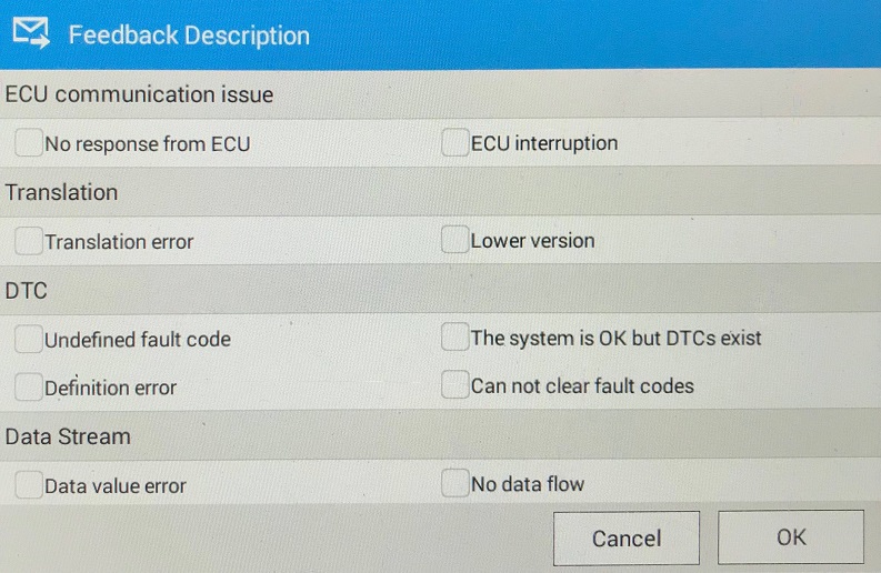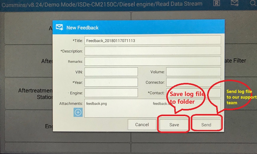 2) There is a new windows -Feedback. On the feedback screen, please fill details info as you can. If your scanner is in your Wifi range, you can send the feedback directly to FCAR support by click on Send.If you don't have Hotspot or out of Wifi range, click on Save, it will save log file into tablet folder.