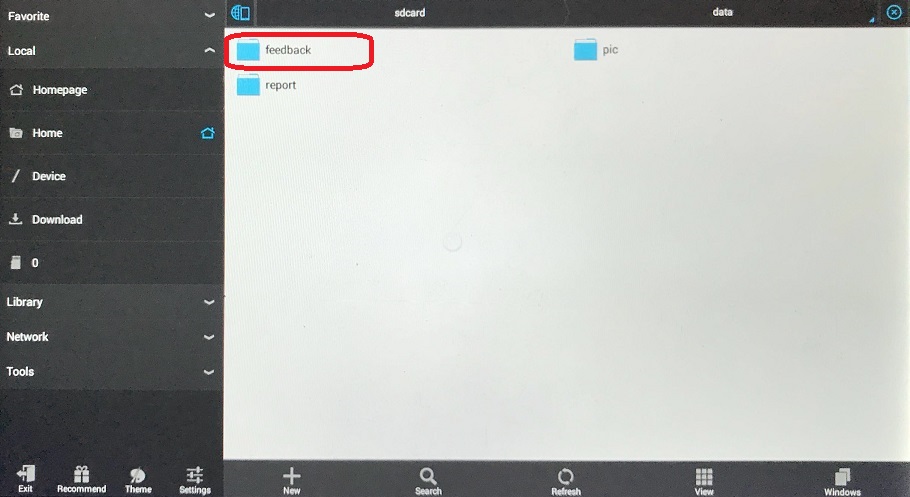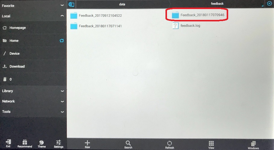 If you select Save into tablet folder. the following is showing where to find the log file folder. If you already setup email on your tablet Email App, you might use it to attache all the files and manually send it to support@fcarusa.com. Or you can plug your tablet into your computer by USB cable, then you will be able to access tablet folder from your computer. When you plug tablet by USB cable into your pc, the tablet will be a USB flash drive.
