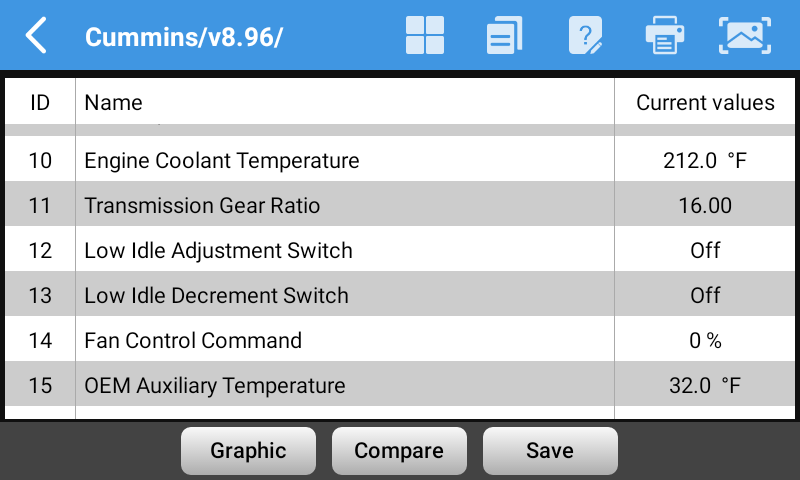 • Read live sensor data, displayed in list or graphic chart mode