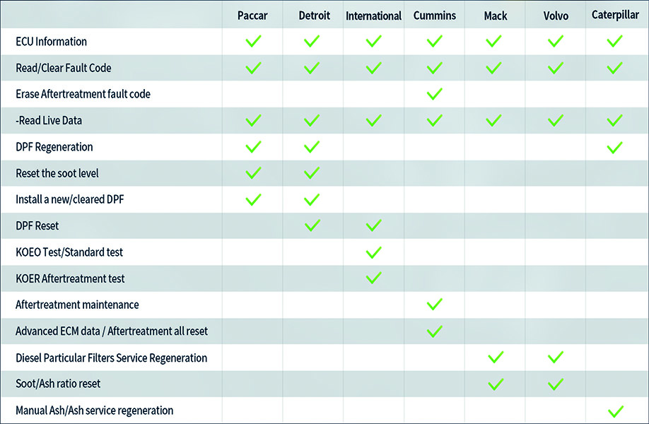 • Perform DPF aftertreatment forced regen for Cummins, Caterpillar, Detroit, International, Mack, Paccar, and Volvo engines