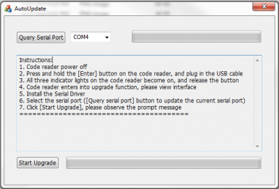 1. Hold scanner's "Enter" key and connect USB cable to your Windows PC (Mac is not supported), and then release "Enter" key. The scaner will go into Update Mode screen.