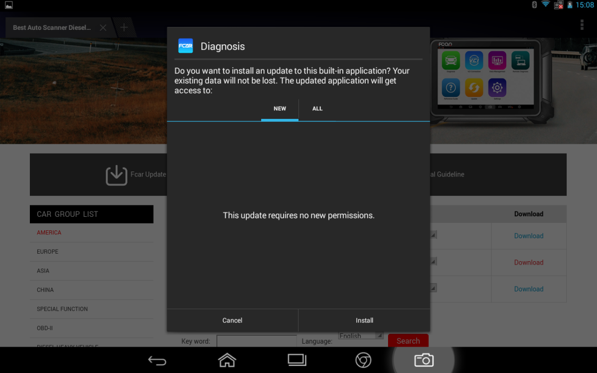 If you are just recent purchase the update and still showing “license expired” under vehicle database, you need to open browser and type in http://download.fcar.com to download Diagnose APK manually and install on the tablet.